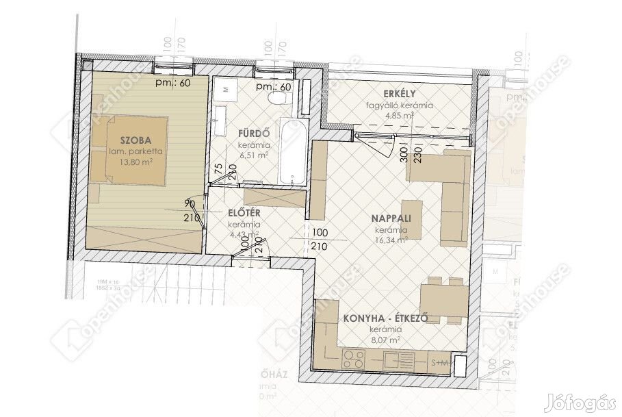 - nappali + 1 hálószoba, konyha-étkező, fürdő, előtér elosztású