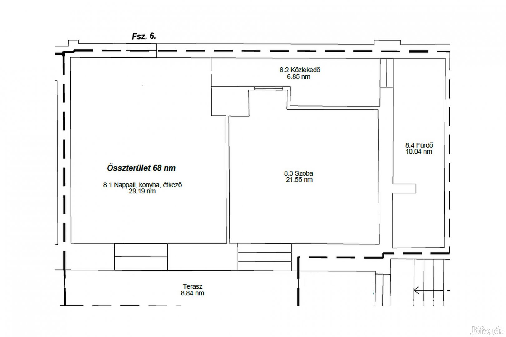 A földszinten levő 68 négyzetméteres 6. lakás a következő helyiségekkel kerül kivitelezésre: nappali, szoba, konyha, fürdőszoba, WC és egy 9 négyzetméteres terasz. Ára: 68 512 500 Ft