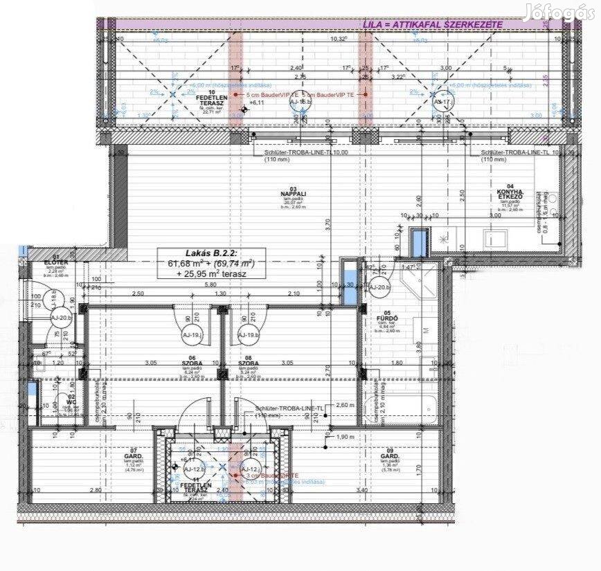 22,71 m + 3,24 m = 25,95 m terasz, melynek fele beszámítható,