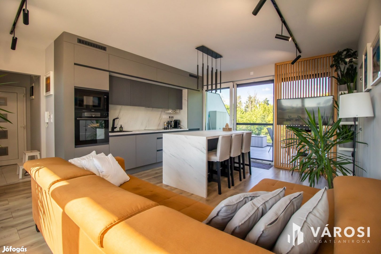 A konyhabútor is méretre készült és a legkorszerűbb gépekkel van felszerelve, amik természetesen itt maradnak szintén. A nappaliban igényes ülőgarnitúra csábít a pihenésre, tévézésre.