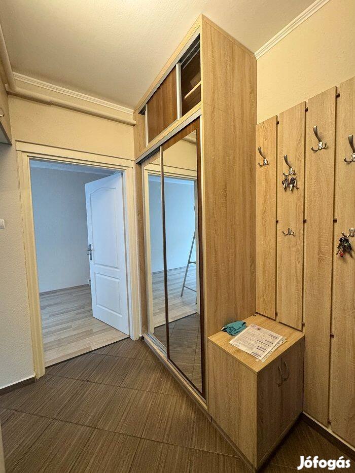 A lakás elosztása praktikus: két külön nyíló szoba, konyha, előszoba, fürdőszoba és külön WC található benne. A szobák laminált padlóval, a többi helyiség járólappal burkolt. Az előszobában egy rendkívül praktikus beépített szekrény található. A kisebbik szobában szintén beépített szekrénysor kapott helyet, amely a vételár részét képezi. A nagyszobából nyílik egy 3m2-es erkély. A nyílászárók műanyagra lettek cserélve, redőnnyel és szúnyoghálóval felszereltek. A fűtést és a melegvizet egyedimérős távhő állítja elő. Közös költség: 8000Ft.