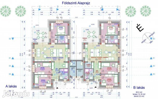 Mindkét ingatlan elosztása teljesen egyforma a jobb oldalihoz egy 20nm-es garázs tartozik, a bal oldalinál autóbeállási lehetőség van.
