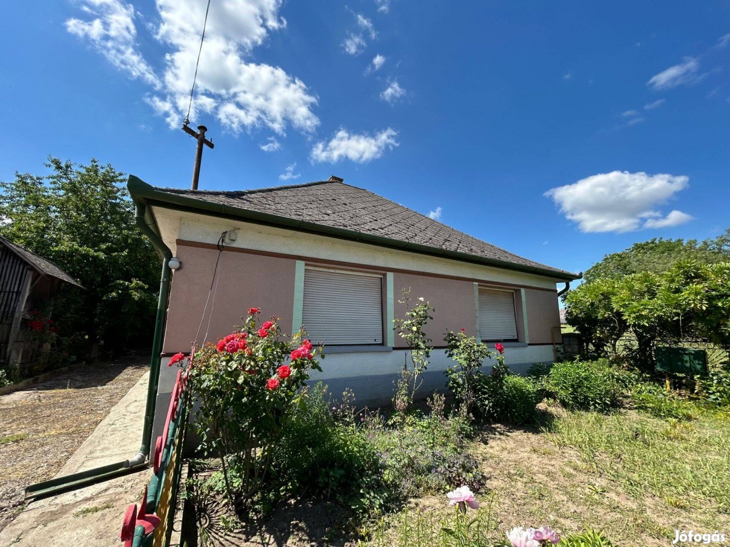 Az udvara parkosított, több- állattartásra is alkalmas tároló található rajta.