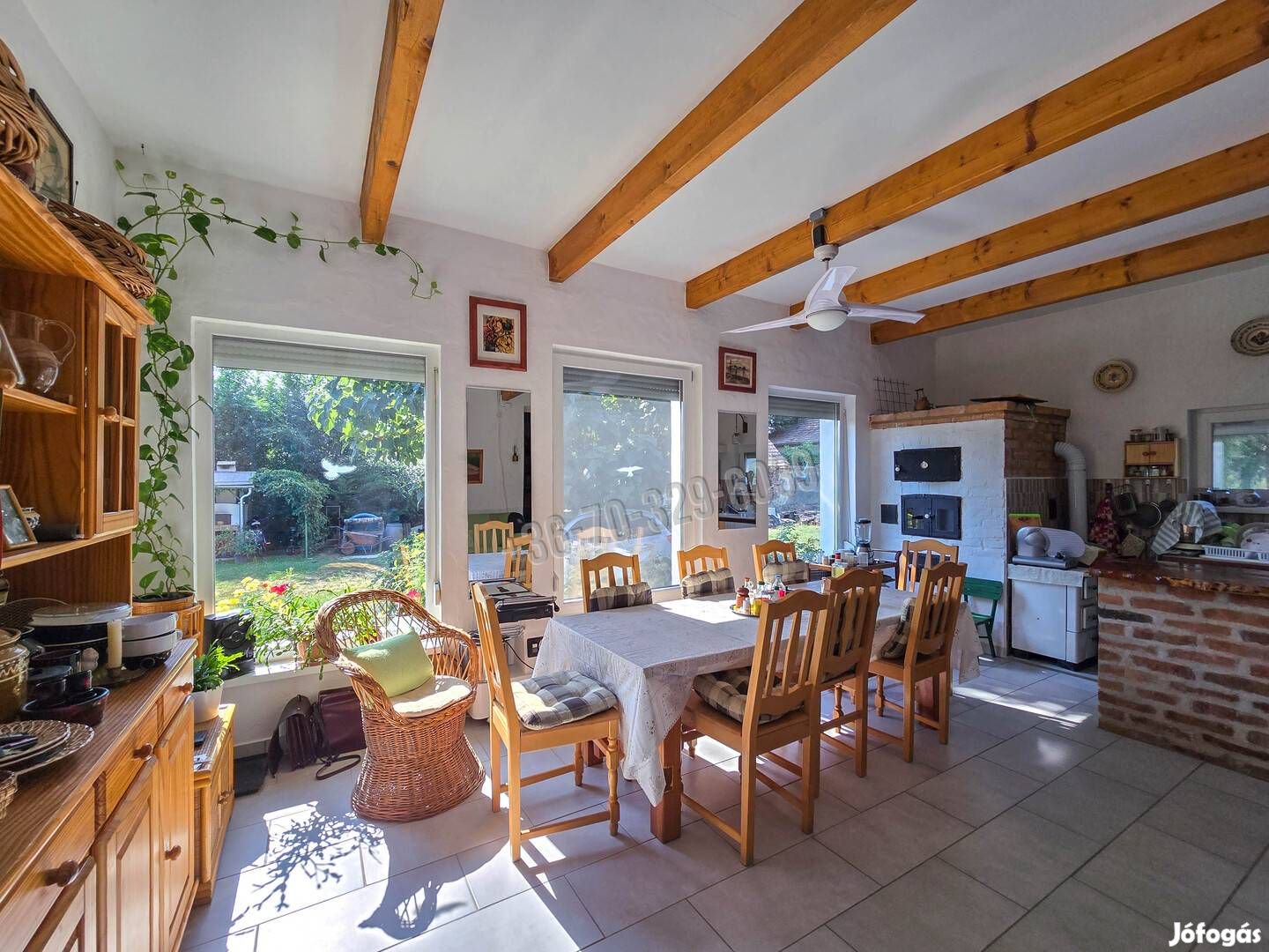 gáz a kapu előtt, 4,5 Kw-os inverteres, telefonról is müködtethető klíma, 15 köbméteres halastó, 3 db. garázs, 60 rózsatő, 300 tőke termő szőlő, gyümölcsfák.