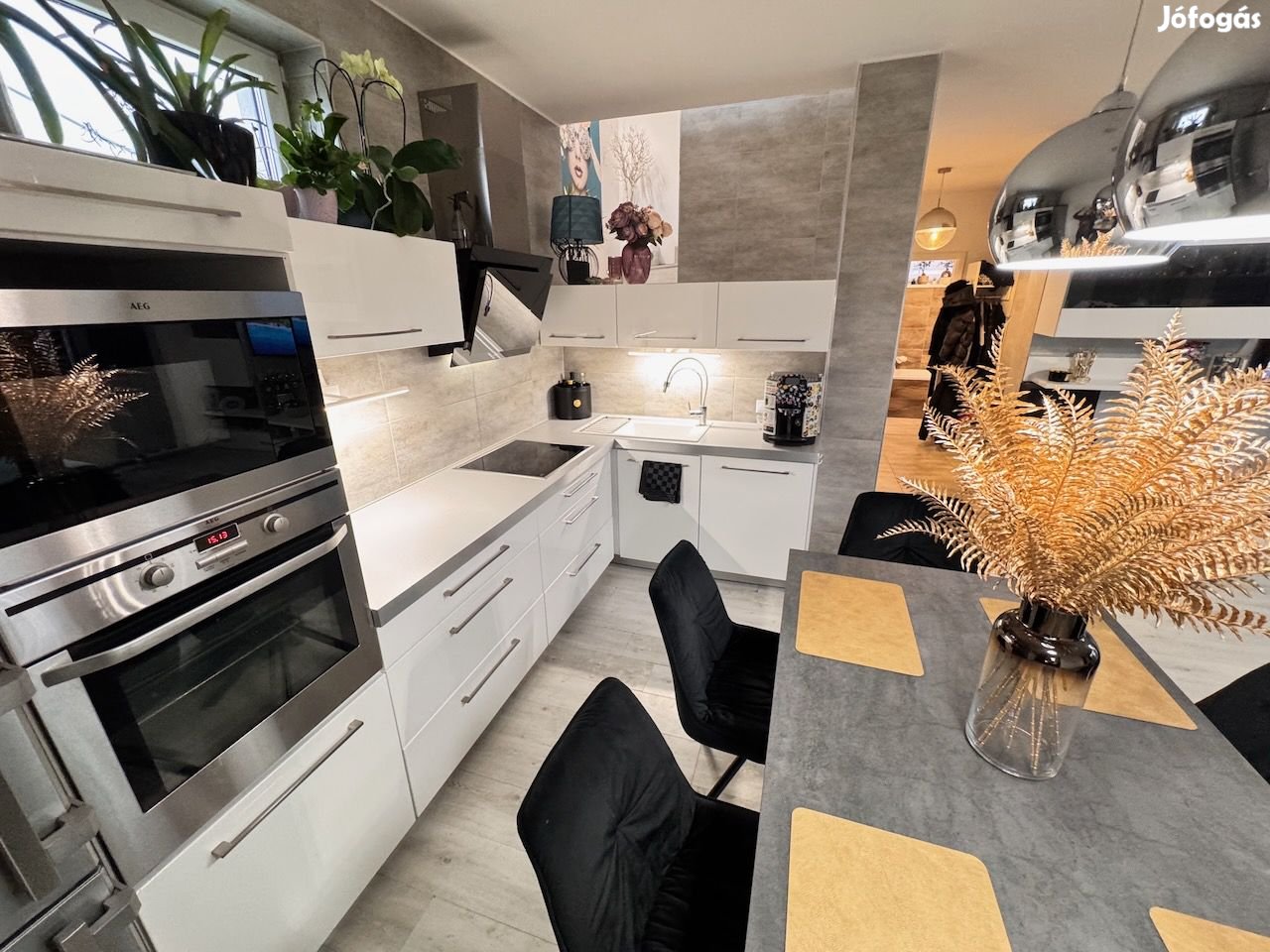 A 10 éves ingatlan kitűnő állapotban van, a tulajdonosok remek ízlésének köszönhetően az akkor választott magas minőségű burkolatok ma is divatosak. A magasfényű fehér konyhabútor gépesített: fagyasztós hűtőszekrénnyel, beépített mikrohullámú sütővel, elektromos sütővel, kerámia főzőlappal, páraelszívóval és mosogatógéppel felszerelt.
