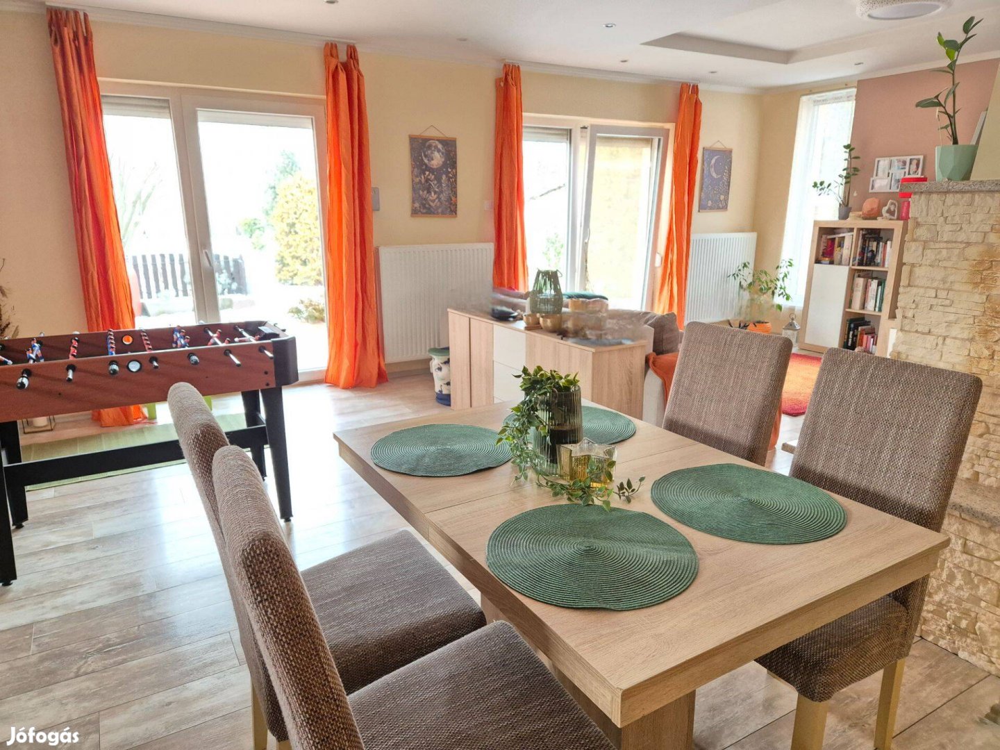Műanyag, hőszigetelt nyílászárók, fűthető garázs, járólapozott terasz, mosókonyha, sportszoba, gépesített konyha, parkosított udvar, fúrt kúttal, veteményessel, gyümölcsfákkal.