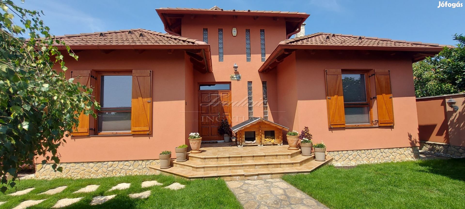 Győr kertvárosi részén, Gyirmót forgalom mentes utcájában eladó egy mediterrán stílusú, minden igényt kielégítő, 1092 m2-es gyönyörűen parkosított zárt-intim telken elhelyezkedő, magas színvonalon kivitelezett, rengeteg extrával felszerelt br. 275 m2-es duplakomfortos újszerű luxusingatlan!