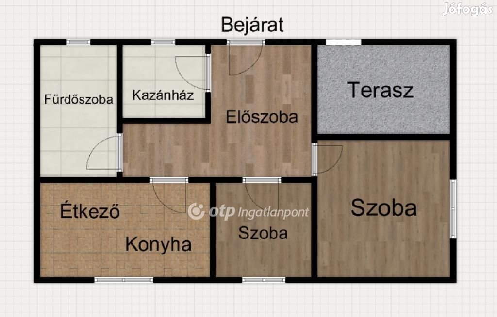 1+1 szoba, étkezős konyha, fürdőszoba WC-vel, előszoba, valamint egy tároló/kazánház.