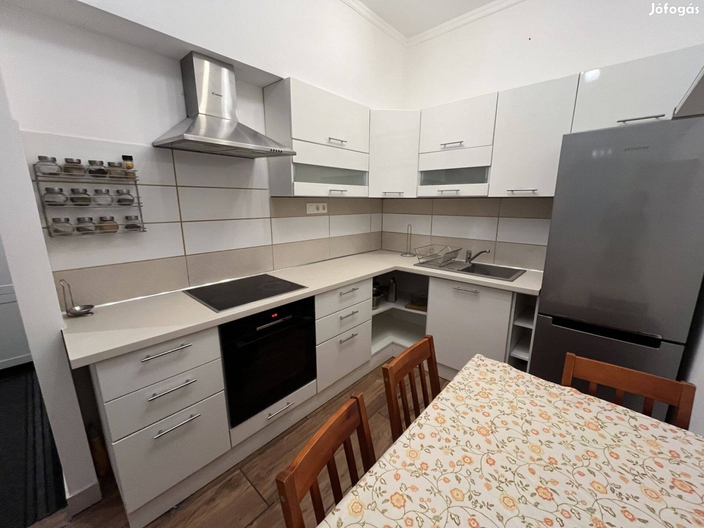 A lakás igényesen berendezett, jó minőségű bútorokkal, gépesített konyhával, elegáns nappalival és ízlésesen kialakított hálószobával rendelkezik.