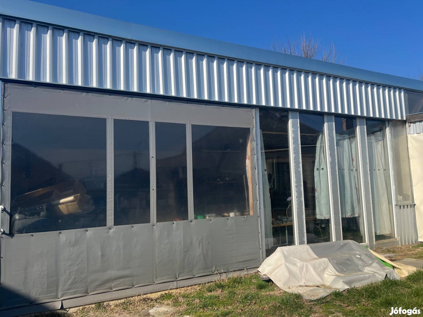 Konnyuszerkezetes bonthato szallithato muhely elado. Kivaloan alkalmas muhelynek, raktarnak, teraszbeepitesi lehetoseg, vagy akar remek telikert is lehet. Autoszereles? nem problema.10 cm tozeggyapottal van hoszigetelve. Gerendazat 10x8 illetve 10x10 es meret. Fem vaz, fa tetoszerkezeti gerendak. trapezlemez , ponyva atlatszo oladalfalak, belul gipszkarton. Alapterulet: 15mx8 m .A belmagassag 4 m rol3 m re csokken. Azonnal viheto!!!! Csak szetszerelessel!!!!!Bontasban segitunk. Olcsobb mint Megepiteni!