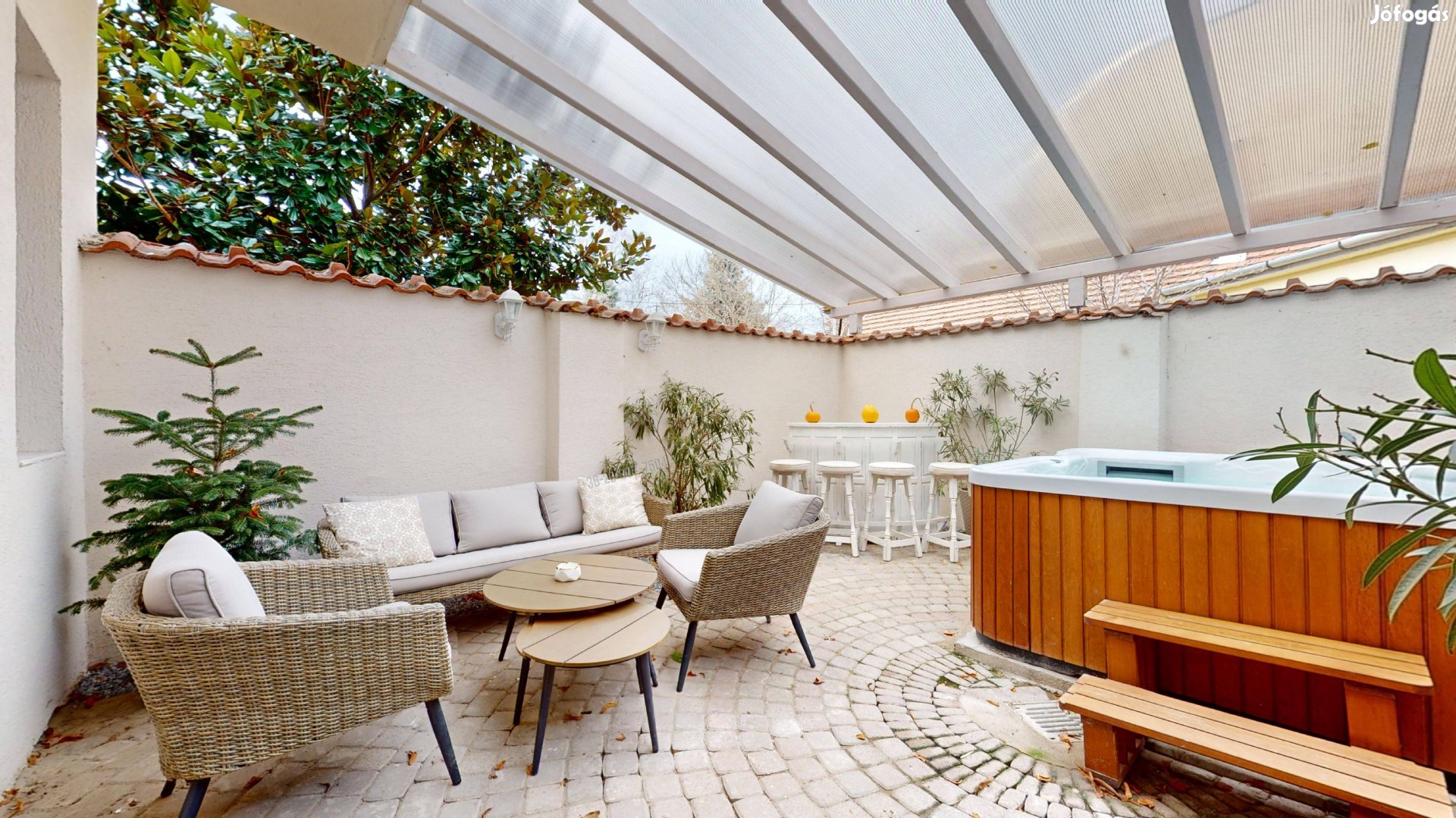 Ingatlan: 140 m2: 2 nagy szoba, konyha, étkező, tágas előszoba, hall kialakítású, az épület alatt egy kb: 50 m2-es pince lett kialakítva klubszobának. A terasz polikarbonát fedésű kb 60 m2-es, itt egy 5 személyes jakuzzi lett telepítve.