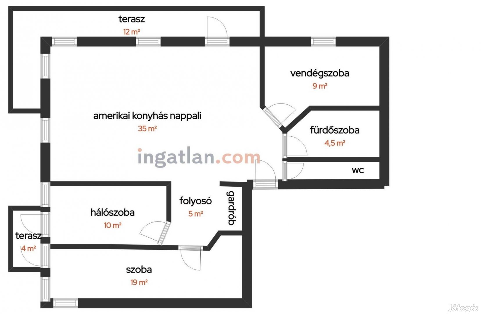 - 83 m2 hasznos alapterület, és tartozik hozzá 12 m2 terasz, és 4 m2 terasz, + 2 m2 ablakkal ellátott tároló