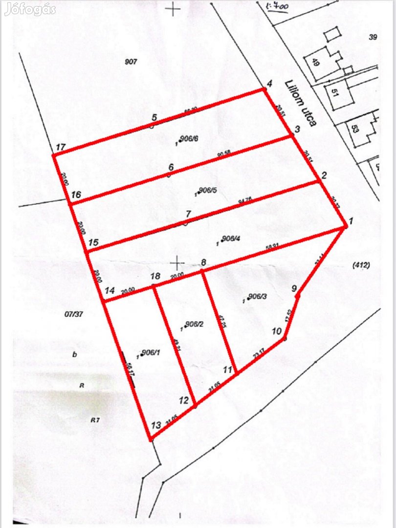 A 906/3, 906/4, 906/5, 906/6 helyrajzi számú telkek cca. 2000 nm nagyságúak, a 906/1 és 906/2 helyrajzi számú telkek cca. 1000 nm-esek.