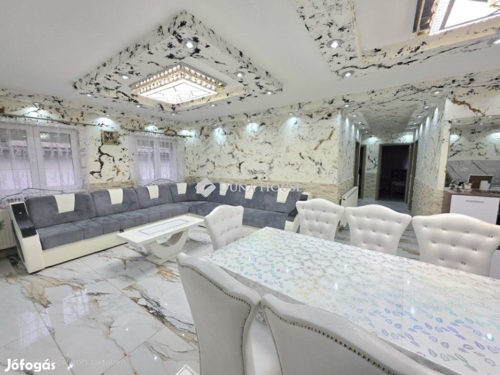 A nappali különleges hangulatát a falakon végigfutó, márványmintás design folyékony tapéta adja.Az udvar zúzott kővel lett tömörítve, ami esztétikus megjelenést, egyben rendkívül praktikus, könnyen karbantartható felületet biztosít. A telken található lemezgarázs a vételár részét képezi. Az elektromos kapunyitó rendszernek köszönhetően pedig kényelmes a be- és kihajtás biztosított a telekre. A biztonságról beépített riasztórendszer gondoskodik, amely a kamerarendszerrel együtt teljeskörű védelmet nyújt az egész ingat