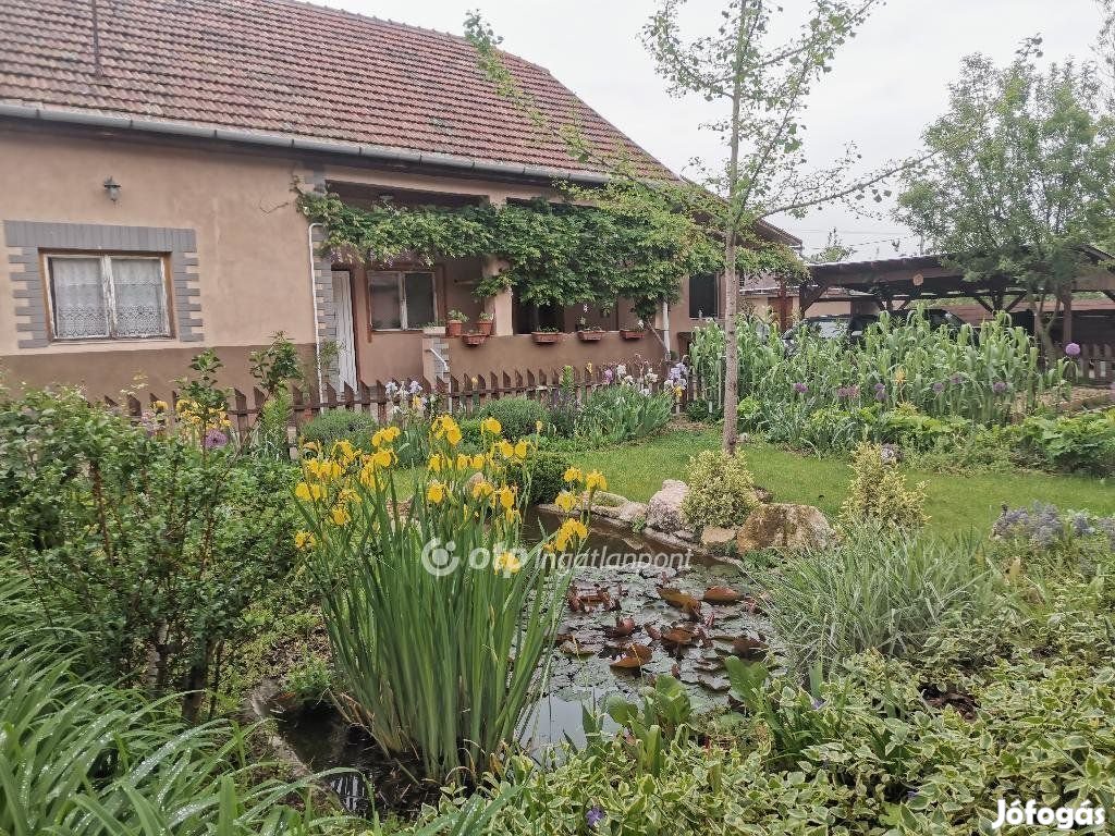 A házhoz két autó számára kialakított kocsibeálló és egy hangulatos, angol stílusú kert tartozik kerti kiülővel. A telek mögött már mezők húzódnak, a közelben patak csordogál.