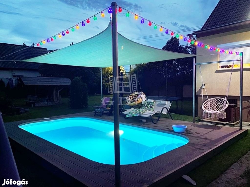 Az 1 éves feltekerhető ponyvás 25m2 kibetonozott, műanyag testű medence, víz alatti világítással, WPC burkolattal, teljes gépészettel,10 kW hőszivattyús fűtésssel,10 kW Solár fűtéssel, összesen 20 kW fűtőteljesítménnyel, krómozott Solari kerti zuhanyzóval várja új tulajdonosát!