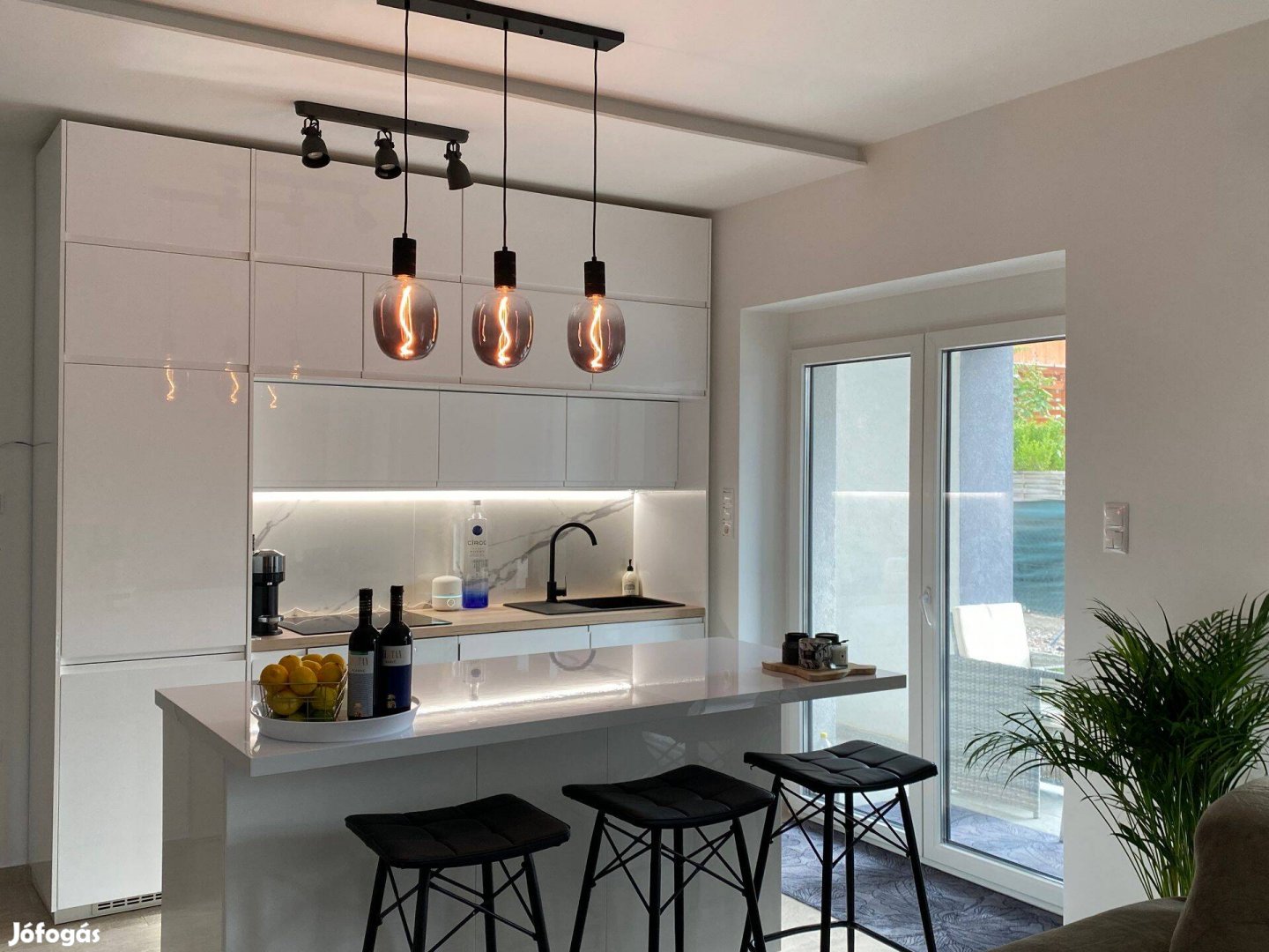 Fehér magasfényű, modern beépített konyha, konyhaszigettel