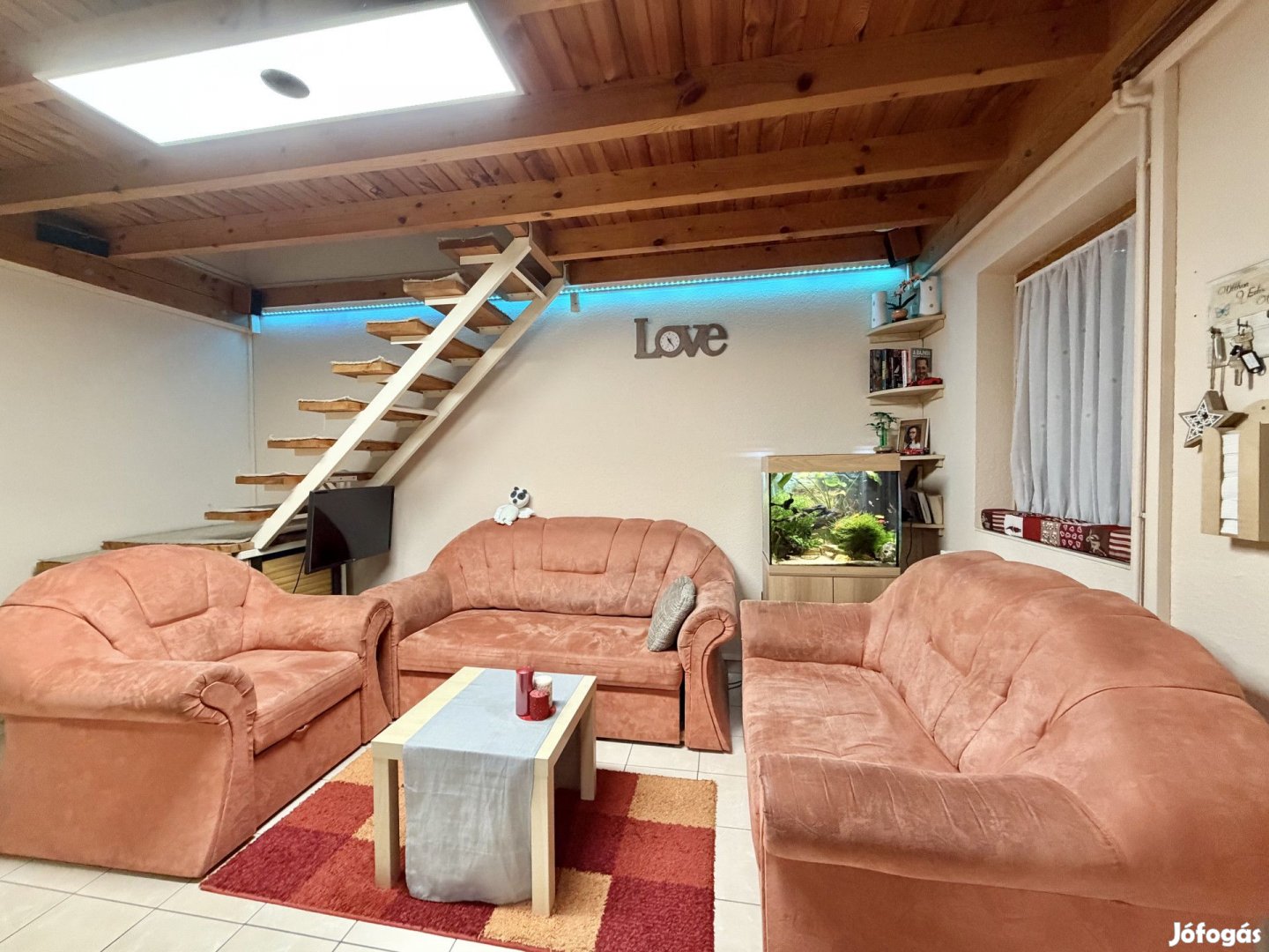 A 2007-ben épült lakás praktikus kialakítású.  Az alsó szinten egy világos nappali és azzal egy légtérben kialakított, modern, egyedi tervezésű konyha, valamint egy esztétikus fürdőszoba kapott helyet.