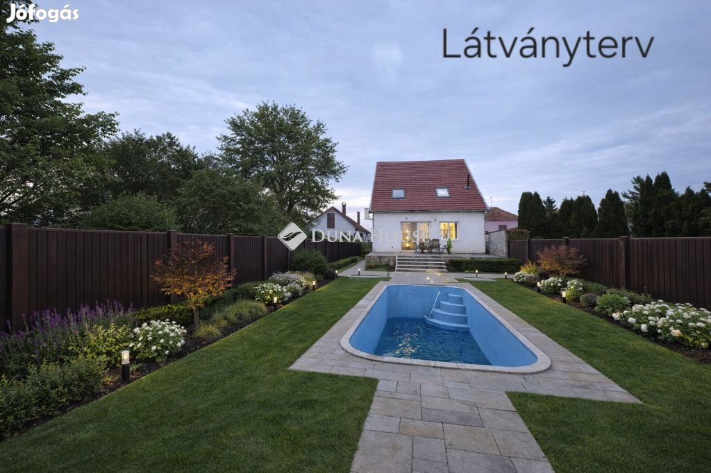 Klotild-telepen eladó egy önálló, 160 m-es, több szintes családi ház, 40 m-es fedett terasszal, garázzsal és medencével!