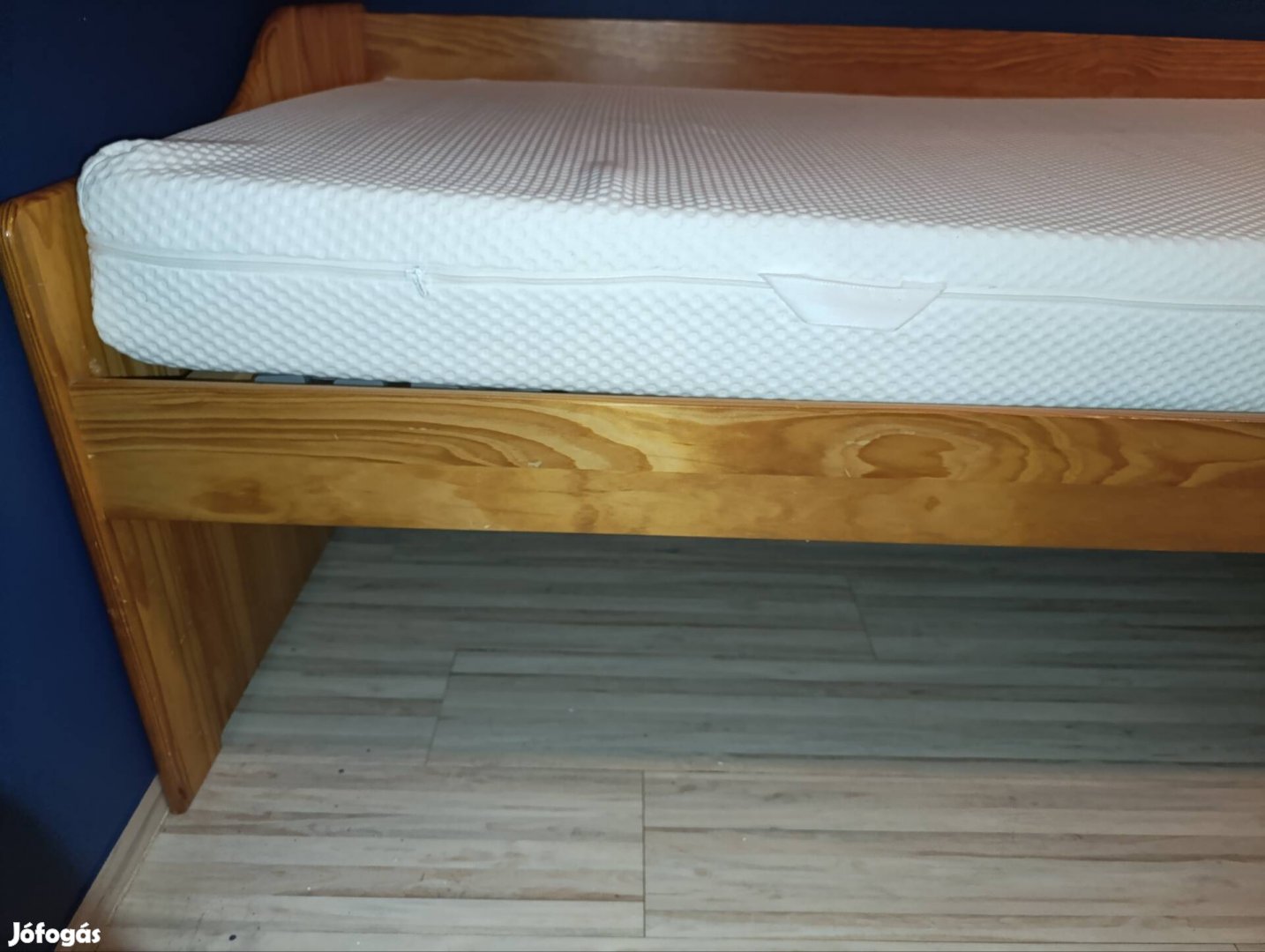 Praktikerben vásárolt stabil fenyő ágykeret, ágyneműtartója és egy kis ágy alatti fiókos szekrénye van. Szerkezeti hibája nincs, használt állapotú.