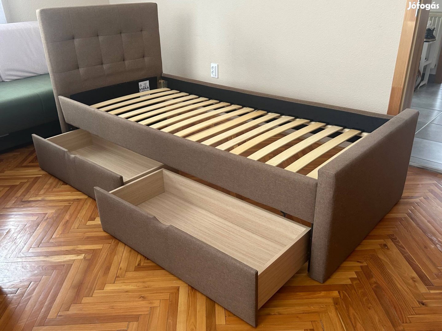 Eladó a képen látható, újszerú állapotban lévô, kárpitozott, ágynemútartós gyerekágy ágyráccsal.