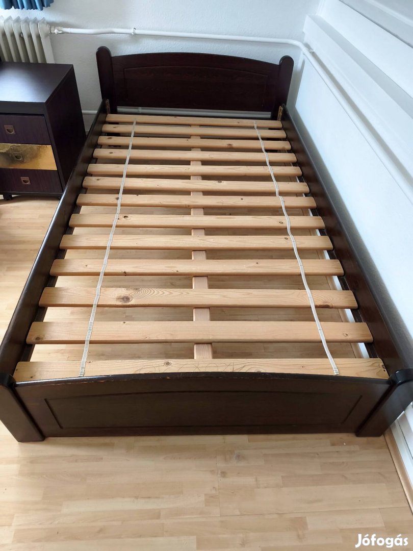 Nagyon masszív sötétbarna fenyőágy ágyráccsal és kemény 10 cm vastagságú matraccal