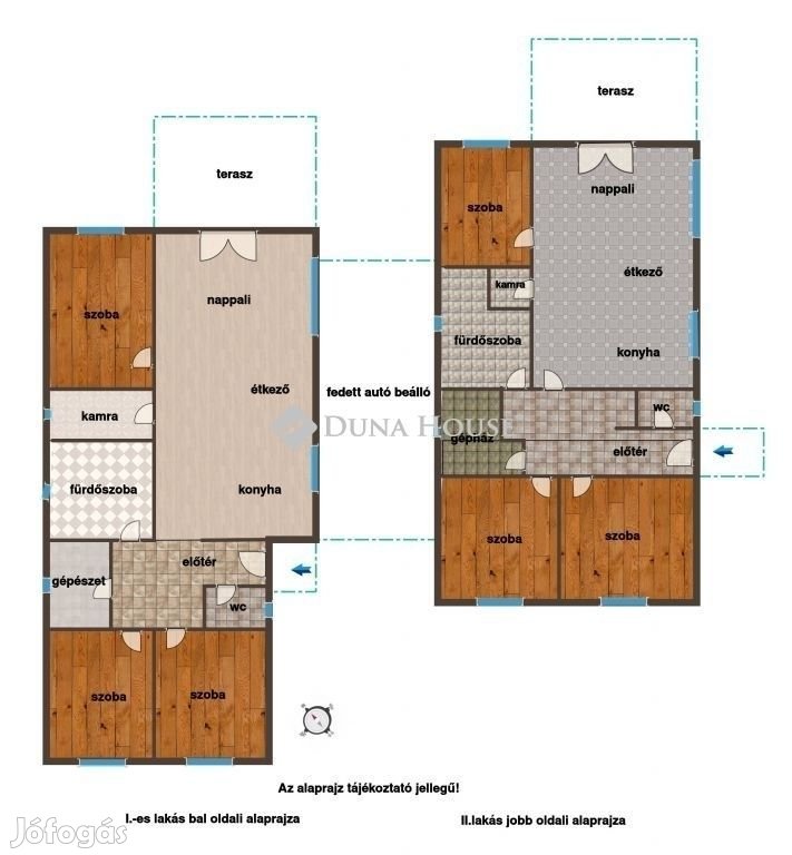 Az utcáról nézve bal oldali lakás bejárata az oldalkert felől nyílik.