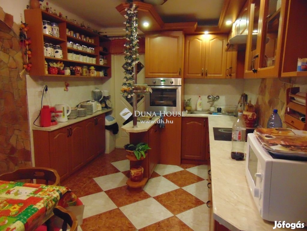 A földszinten található előszoba, közlekedő, 1,5 szoba, konyha étkezővel, fürdőszoba, külön WC, kamra, tágas fedett terasz és dupla garázs. Az emeleten közlekedő, 2 erkélyes szoba, 2 félszoba, tágas nappali konyhával, fürdőszoba és 2 WC található. A szobák laminált- és szőnyegpadlóval burkoltak, míg a többi helyiség járólapot kapott. A fűtést gáz-cirkó kazán biztosítja radiátoros hőleadással, de vegyes tüzelésű kazán is rendelkezésre áll.