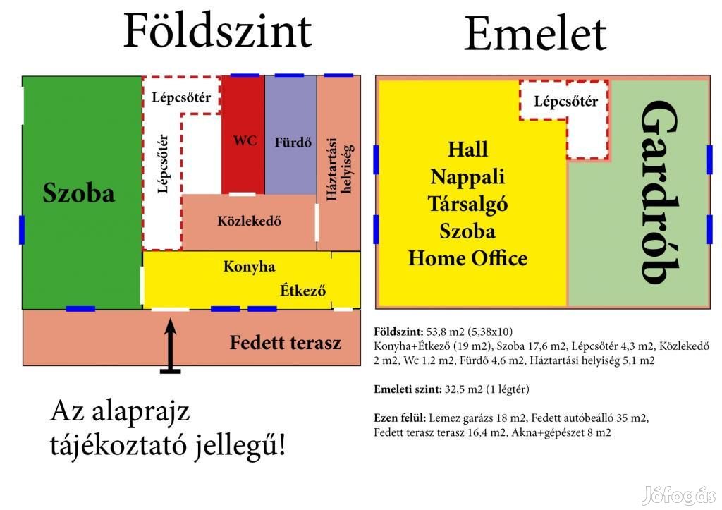Földszint: 53,8 m2 (Konyha+Étkező (19 m2), Szoba 17,6 m2, Lépcsőtér 4,3 m2, Közlekedő 2 m2, Wc 1,2 m2, Fürdő 4,6 m2, Háztartási helyiség 5,1 m2)