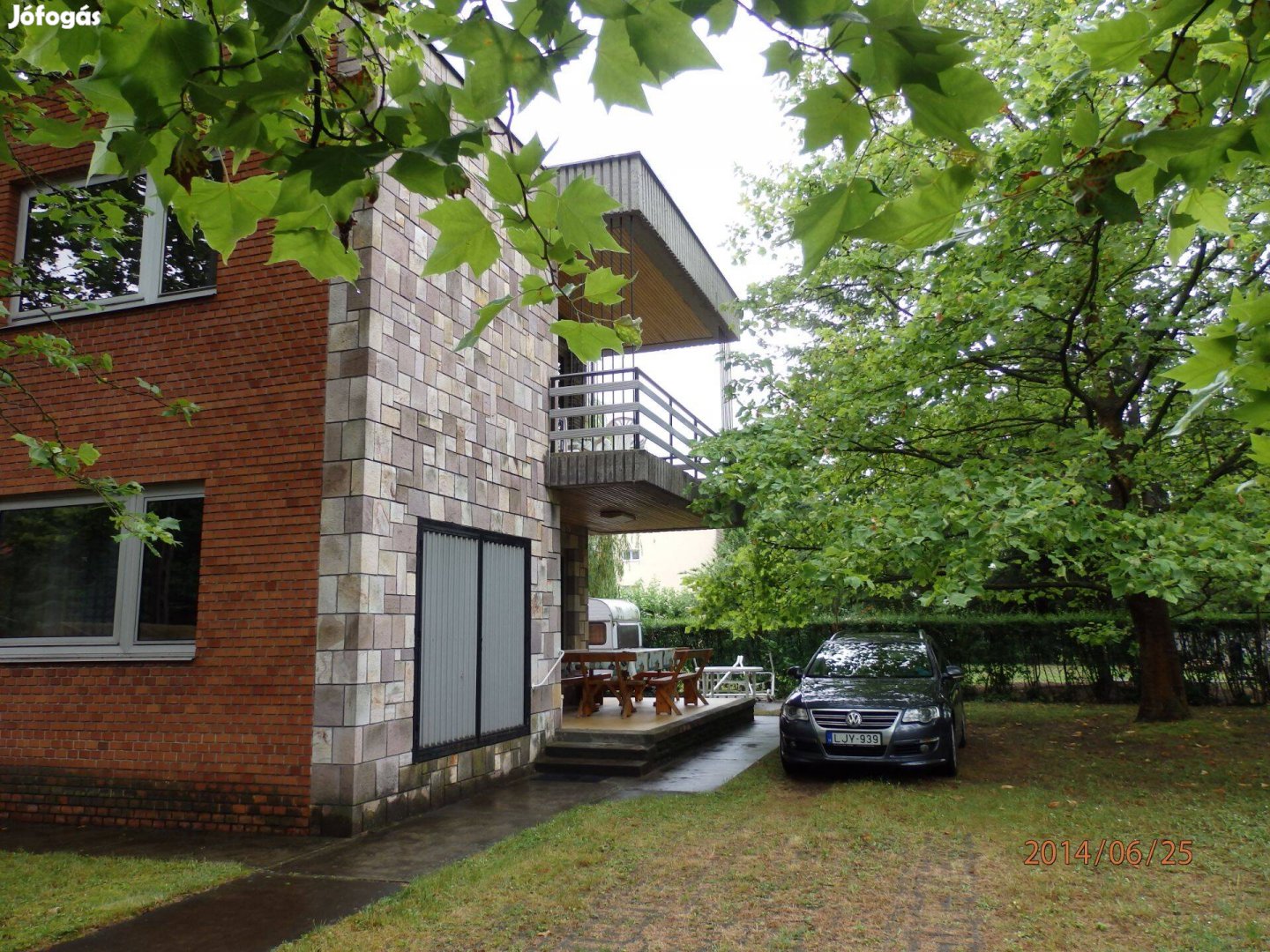 Balatonföldvár frekventált területén, a Keleti strandtól 200 m-re, a város központjától és a hajókikötőtől 6 percnyi sétára kínáljuk eladásra a fenti ingatlant. Az épület egy ikerház fele, viszont nem a klasszikus elrendezésben, hanem a két terasz egymással ellentétes oldalon található. A ház az 1980-as években épült, rendkívül masszív szerkezetű téglaépület, lapos tetős kivitelben. A tető 3 éve lett újraszigetelve. Belső elrendezésében a földszinten közlekedő, kis konyha, kamra és egy 2 légtérből álló nagy alapterületű nappali/szoba található. Innen nyílik egy nagy méretű terasz. A lépcsőn felérve itt is egy közlekedőbe érkezünk, ahonnan nyílnak a szobák (1 nagyobb és egy kisebb méretű terasszal), és a fürdőszoba.
