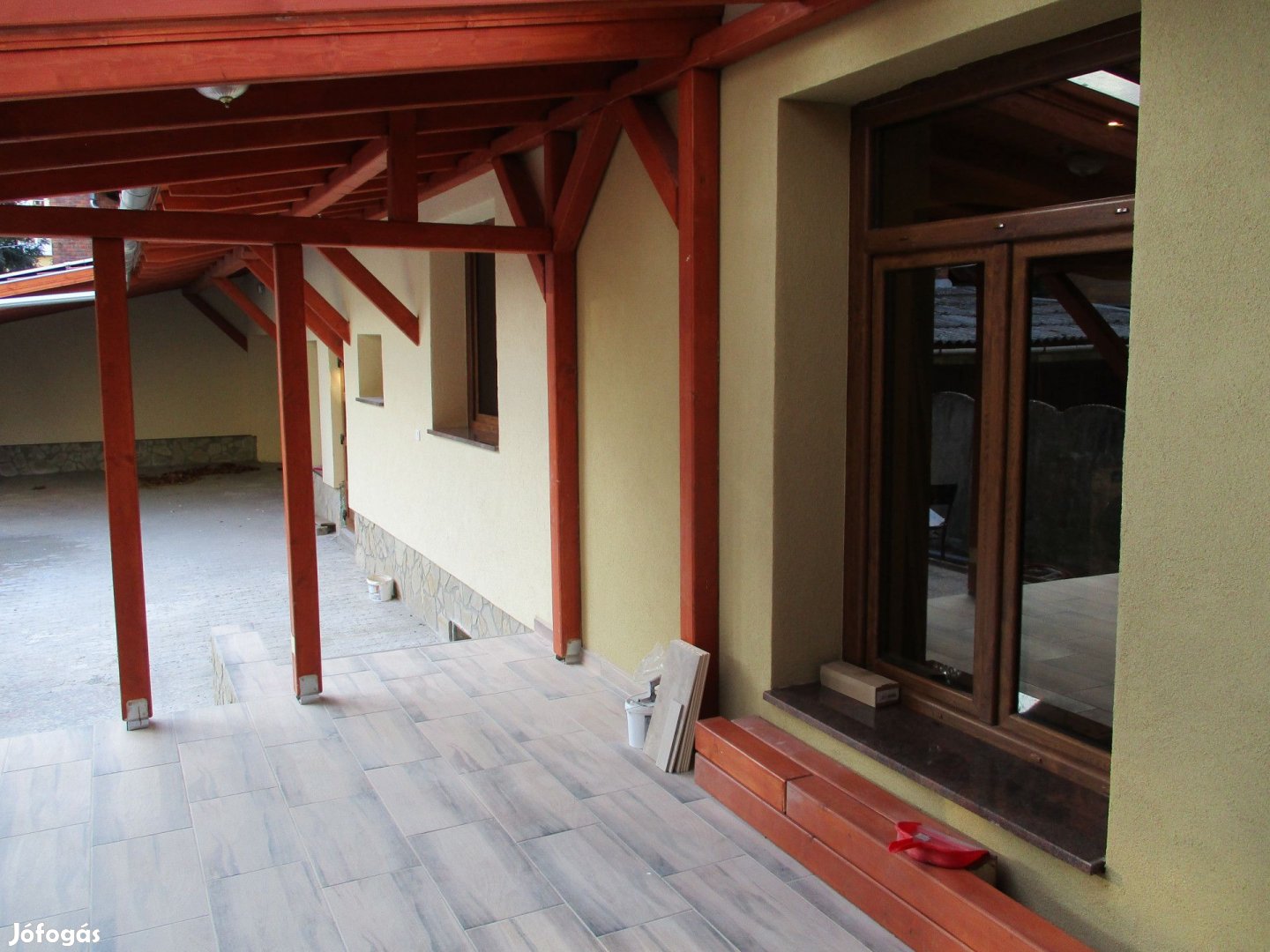A mennyezet gipszkartonos, kőzetgyapot szigeteléssel. A napelem rendszer 3.6 kW-os (nincs villanyszámla). Természetesen a külső falazat is hőszigetelt. A térköves udvar végén egy fedett tárolót építettek.