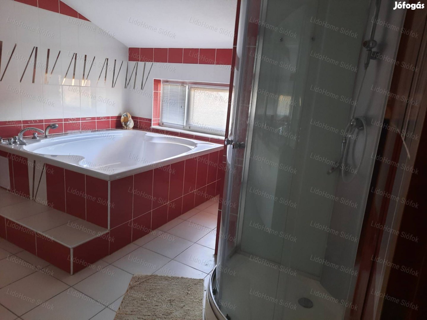 Ötmilliós áresés!!! Siófok szabadi-fürdői városrészében, pár száz méterre a Balatontól eladó egy jól bejáratott, színvonalasan megépített vendégház, visszatérő vendégkörével együtt! A két szintes, 7 szobás, 3 fürdőszobás, jó állapotban lévő ház 873 m2-es, gondozott, parkosított udvarral rendelkezik, biztonságos, csendes környezetben. A kertben fúrt kút és öntöző rendszer, gyermekjátszótér, szalonnasütő, grillsütő is van kiépítve. Műanyag nyílászárós, redőnnyel és szúnyoghálóval felszerelve, két szobában klímával, kiépített riasztó rendszer. A konyha hatalmas éttermi résszel csoportok étkeztetésére, vagy családi, baráti összejövetelek tartására is kiváló. Különösen, ha a szintén hatalmas, mintegy 70 m2-es fedett teraszt is beszámítjuk! A tulajdonosnak már idén nyárra is több visszatérő csoportja van, akik maximum 15 fős társaságokkal érkeznének nyaralni. Az ingatlan eladása esetén a teljes berendezést, valamint a vendégkört is átadja a tulajdonos. A családi ház a nyaraltatáson túl (vagy: helyett) természetesen nagyobb családnak állandó lakásra is kiváló lehet.