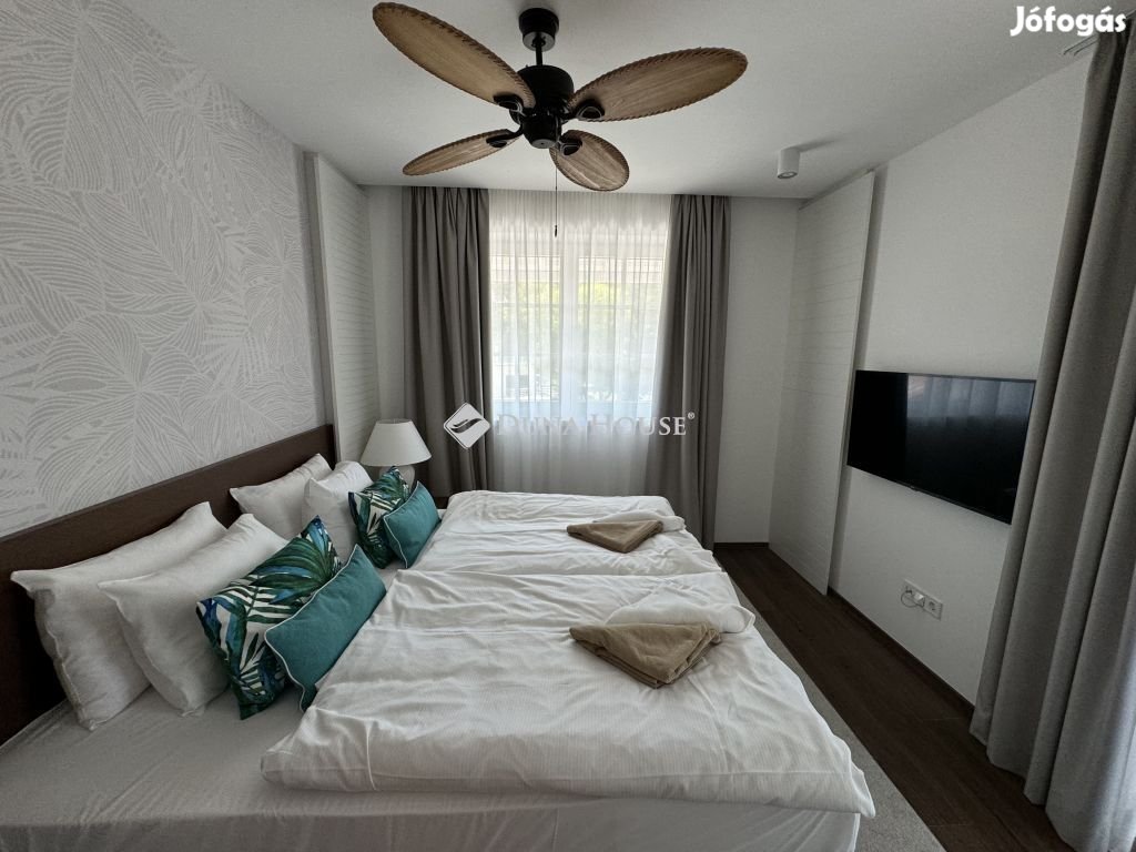 Eladó panorámás luxusapartman a BalaLake Resort-ban! A BalaLake egy igazi kuriózum a Balaton partján! Budapesttől alig több mint egy óra alatt elérhető ez az egyedi szolgáltatásokat biztosító luxus apartmanház. Közvetlen vízparton helyezkedik el, a Tihanyi félszigettel szemben, saját stranddal, parti bárral. A szomszéd komplexum a Balaland egy a 80 nap alatt a Föld körül Willy Foggal tematikájú, egész éves nyitva tartású családi élménypark és wellness, melynek szolgáltatásait az apartman tulajdonosok is élvezhetik. Ehhez kapcsolódik egy szálloda, melyben étterem is található. A Szálloda szolgáltatásait, szintén a tulajdonosok szolgálatába állítva, akár a szobaszervíz, takarítás, laundry szolgáltatás, portaszolgálat is igénybe vehető.Itt az egész család megtalálja a neki való programot, kényelmet, kikapcsolódást. Ha esetleg befektetésben gondolkodna, annak is ideális, hisz amikor nem Ön használja, akár ki is adhatja, helyi managment cég kezeli, működteti a rövidtávú kiadást. A 2. emeleti apartman 88m2-es, két terasszal rendelkező, amerikai konyhás nappali, plusz két hálós, teljesen bútorozott és gépesített. A lakáshoz tartozik egy teremgarázshely, és egy tároló is és ha ez nem lenne elég, egy saját tulajdonú partszakasz is, két napággyal, napernyővel, amit csak a tulajdonos használhat! Jöjjön el, és nézze meg ezt a minden képzeletet felülmúló Balaton parti ingatlant!!4!(az ingatlan cég tulajdonában van, az ár bruttó ár)