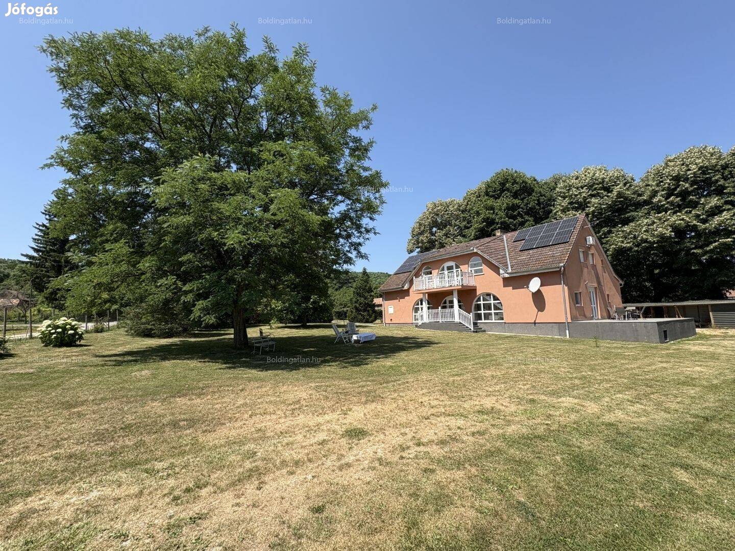 Visnyén a Zselici dombok között megbúvó csendes kis faluban, vidéki rezidenciának alkalmas, korszerű energetikájú 400 m2-es családi ház, mindösszesen 2x40 m2-es - belső udvar felé néző - terasszal, és saját 1.500 m2-es udvari tóval együtt eladó. A lakóház alsó szintjén előtér, elegáns nagy belmagassággal rendelkező - nappali-étkező, dolgozó szoba, gardrób, 2 db wc-kézmosóval, 1 vendégszoba, konyha, közlekedő, mosókonyha, kazánház. A szuterénben 25 m2-es, akár hobbiszobának, vagy wellness helyiségnek kialakítható terem kerül kialakításra. A felső szinten közlekedő amelyről terasz nyílik az udvar felé, 3 szoba - önálló fürdőszobával - és egy tároló található. Az épület korszerű energetikájú, a 10 cm-es, hőszigetlet falazata B30-as téglából épült, a fűtése központi rendszerre kötött fatüzelésű kazánnal megoldott, illetve 2 db légkondicionáló került felszerelésre, illetve a tetőn 5 kWh-os napelemrendszer van, 10 kWh kapacitású akkumulátorral. A kényelmet fokozza az automata kapu is, valamint a tulajdonos riasztót is szereltetett fel. Az udvaron 1.500 m2-es, 1,70 m mély tó, illetve 1 személyautó beállásra alkalmas, különálló garázs-tároló található. Telek: 9.415 m2