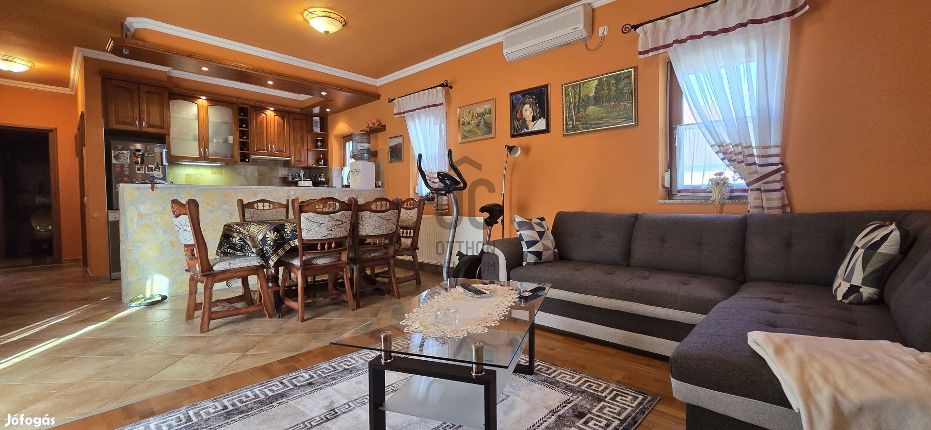 -maga a ház, mely téglából épült 2005-ben, s amelyen már felújítás is történt, és ami ideális méretű otthona lehet egy családnak a három külön nyíló szobájával; két fürdőjével; tágas világos közösségi terével; hangulatos fedett teraszával; gondozott udvarával; medencéjével