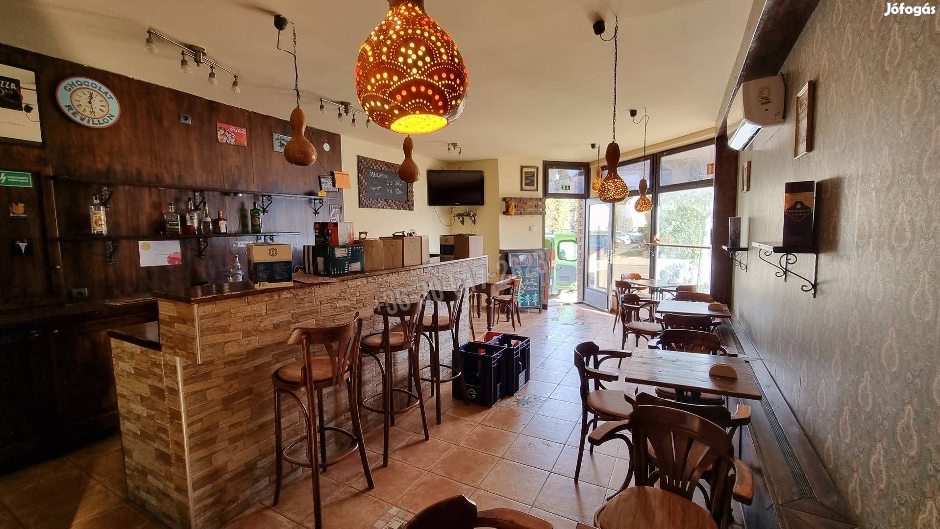 A földszinten egy tágas vendégtér, bár, mosdók és kiszolgáló helyiség található. Az emeleten további vendégtér és kiszolgáló helyiség áll rendelkezésre. A vendéglátó egység két bejárattal rendelkezik, az oldalsó ajtón keresztül elérhető közterület, igény szerint további asztalok elhelyezésére, vagy akár terasz kialakítására is alkalmas. Fűtését kondenzációs gázkazán biztosítja radiátorok segítségével, hűtését szintenként egy új klíma segíti.