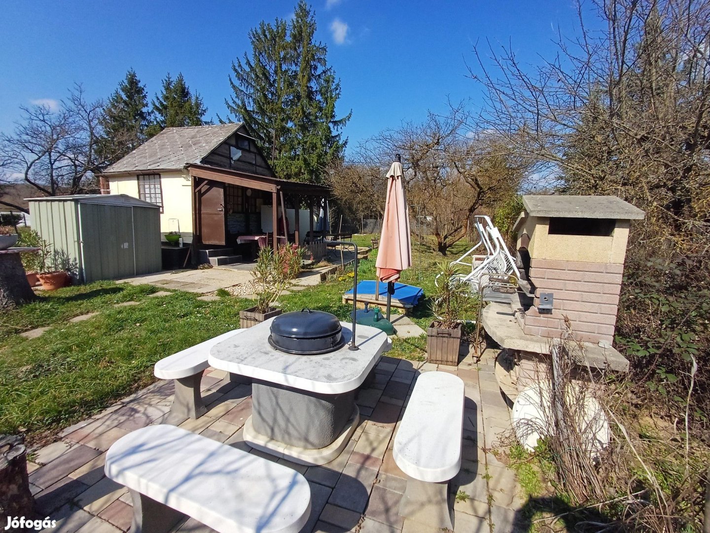 A telek körbe van kerítve. Rajta található még grillező, bográcsozó állvány, rózsakapu, vizestartály is. Gyümölcsfák és virágok színesítik meg a tulajdonos mindennapjait. A felásott kiskertben zöldségeket, paradicsomot és paprikát neveltek. A területre 5 százalékos a telekbeépítési lehetőség van.