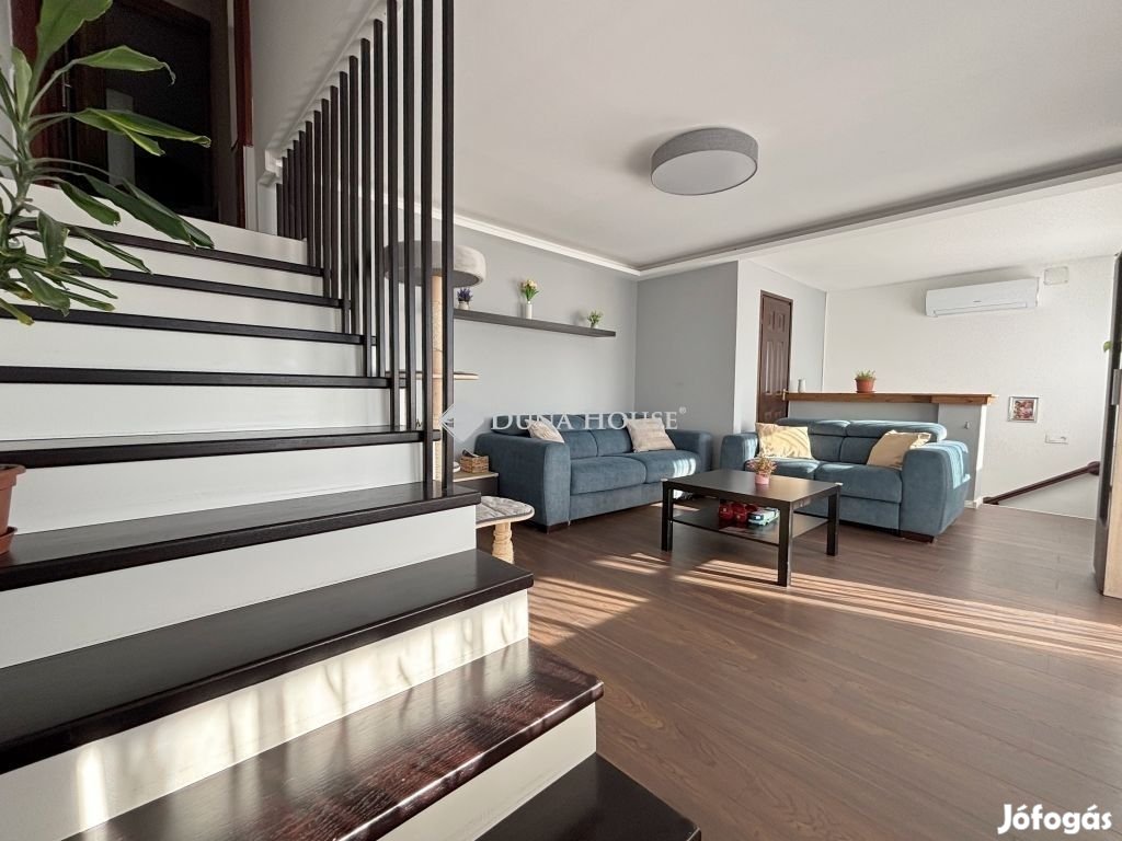 Szombathely kámoni városrészén jó állapotú, nettó 90 m2 alapterületű lakás eladó. Az ingatlan egy kétlakásos társasház utcafronti oldalára nyílik, ahol egy kis udvarrész is tartozik hozzá. A térkövezett udvaron parkolni is lehet egy autóval, további egy gépkocsival a kapu előtti hídon. A lakás nagyobb része két szintre osztott, az emeleten egy tágas világos nappali fedett terasszal és egy mellékhelyiség van kialakítva, a tetőtérben kapott helyet a két hálószoba, a konyha étkezővel, egy fürdő és egy kis háztartási helyiség wc-el. A földszinti bejárati részen van még egy kis tároló és az előszoba. Az ingatlan rendezett karbantartott állapotú, az elmúlt években megújult többek között a nappali, és a nyílászárók is korszerűsítve lettek, az ablakok redőnnyel és rovarhálóval is fel vannak szerelve. A tetőtéri ablakokat tavaly cserélték korszerűbbre.