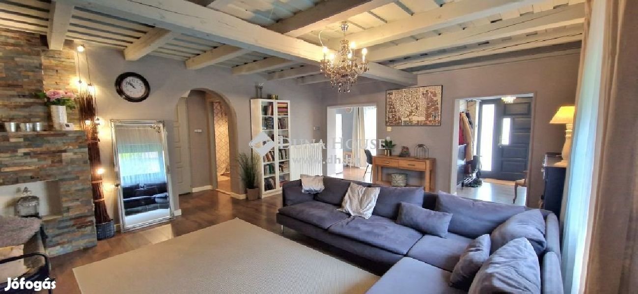 A nappali kétségtelenül szembeötlő eleme a mennyezeti fagerenda, mely szintén felújított állapotban, ápolt külsővel díszíti helyiségünket. Innen nyílik egy tökéletes állapotban lévő fából készült pinceajtó, melyen keresztül beléphetünk be a 12m2-es pincébe.
