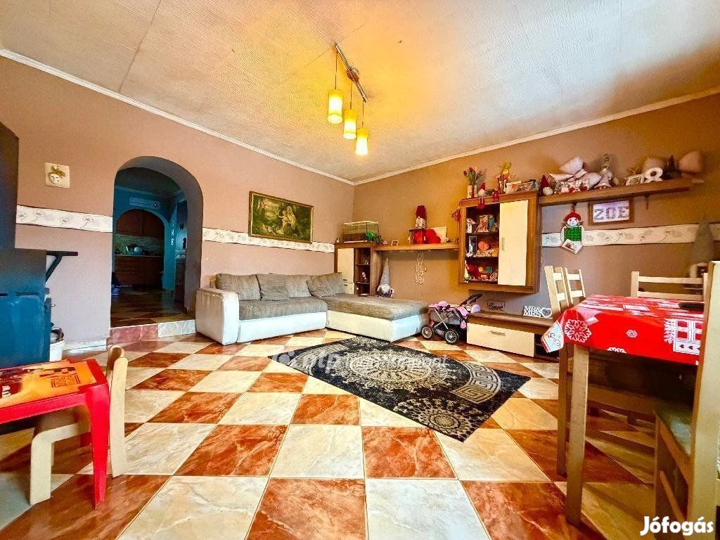 Eladó Veszprém vármegyében, Pápateszér csendes utcájában egy 1962-ben téglából épült, jelenleg 2 szoba + nappalis részben felújított, azonnal költözhető családi ház különálló telken. Az ingatlan elrendezés szempontjából áll egy tágas nappali + étkező helyiségből, 2 db külön nyíló nagyszobából, előszobából, konyhából, fürdőszobából, külön WC helyiségből, szélfogó elosztású. Jelenleg 72 nm a nettó belső alapterülete, viszont a garázs és tároló, mely egy tetősíkban van építve a házzal, bővítésre hivatalosan alkalmas, így a leendő 114,22 nm nagyságával akár 3 gyermekes falusi CSOK.-ra is alkalmas. A ház melegéről fa-tüzelésű kályha gondoskodik, valamint elektromos fűtés teszi teljessé a komfortot. Az ingatlan azt elmúlt években belülről folyamatosan újították, új villanyhálózat rézzel, órától újrahúzva. A teljes vízvezeték rendszere a háznak újra lett húzva, műanyag csövekkel, valamint a teljes épület új hideg - melegburkolatokat kapott, friss glettelést festést. Összességében egy azonnal költözhető családi házról van szó. A külső hőszigetelést jelenlegi tulajdonosa elkezdte, 5 cm-es hőszigetelést helyezett fel, viszont befejezve sajnos ez nincs, leendő tulajdonosára vár a szín kiválasztása. Az ingatlan mögött közvetlenül található egy szerelőaknával felszerelt garázs is, mely 20 nm nagyságú, valamint egy tároló is, amely 19 nm nagyságú. A telek mérete viszonylag kicsi, ugyanakkor nem igényel nagy karbantartási munkálatokat. Ajánlani tudom mindazoknak ezt a családi házat, akik kisebb költségkeretből azonnal szeretnének költözni leendő otthonukba, valamint tartogat a jövőre nézve potenciált akár bővítésre is. Pápateszér település a Bakony alján helyezkedik el, nyugodt, csendes környezetben. Munkalehetőség mind Pápa városa felé (20km távolság) mind Győr városa felé (45 km) megoldott, munkásbusz közlekedéssel. Az OTP Ingatlanpont teljes körű ügyintézéssel áll az eladók és a vevők rendelkezésére. A kínálatunkból választott ingatlan finanszírozásához kedvezményes hitelkonstrukciót kínálunk. Az adásvételi szerződés megkötéséhez igény szerint megbízható ügyvédi közreműködést biztosítunk, és segítséget nyújtunk az adásvételhez kapcsolódó ügyek intézéséhez is. Az ingatlanról készült alaprajz, illetve fényképfelvételek az Otp ingatlanpont szellemi tulajdonát képezik. Amennyiben szeretné megtekinteni az ingatlant, hívjon bizalommal!
