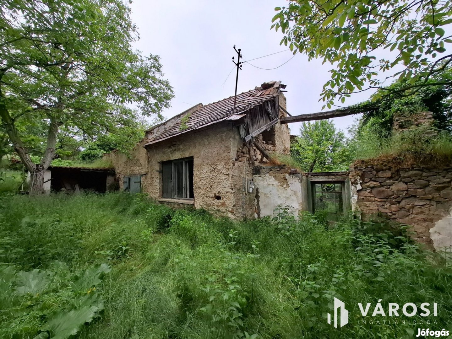 A valamikor szebb napokat megélt épület, az előtte álló ugyancsak romos épület udvarán keresztül szolgalmi joggal megközelíthető. A domboldalon elnyúló telek területe 504 m2, - kilátással a kővágóörsi hegyekre, - oldalhatáron beépített. Az alaprajzon feltüntetett épület falai állnak, helyiségei jól kivehetők. Két szoba, konyha, nappali, fürdőszoba volt a régi házban.