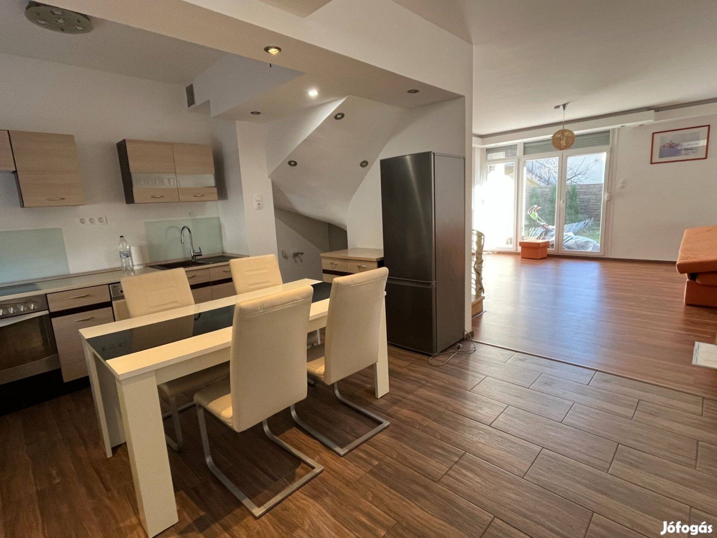 A földszinten egy nagy amerikai konyhás nappali található, ahonnan közvetlen ajtó nyílik a kellemes tárolós teraszra, kertre.