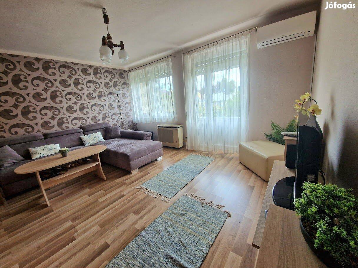 A középső lakás gázkonvektoros fűtésű, cserépkályhás. Új, műanyag nyílászáróin redőnyök és szúnyoghálók is vannak.