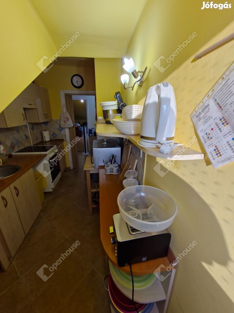 Felső szint: Négy szoba, saját konyha, stílusos fürdőszoba, külön WC, és egy zárt, felújított erkély, ahonnan pazar kilátás nyílik a városra.